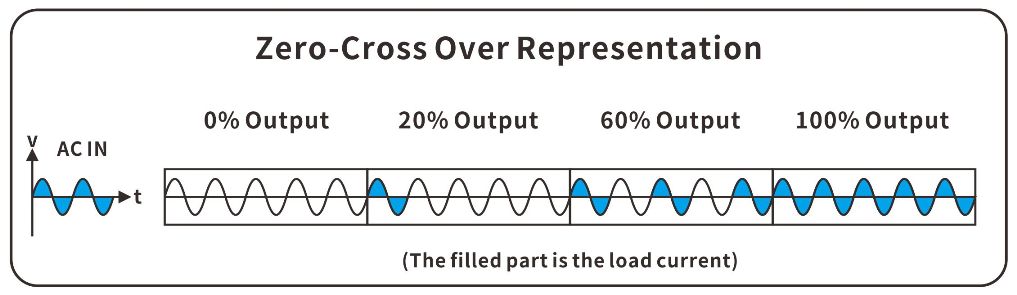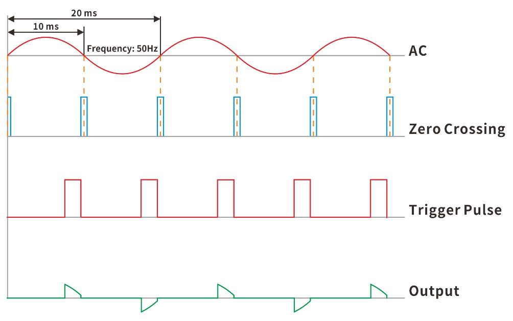 Principle- To provide low current/voltage output on the temperature controller for hot runner, precise control of the AC supplied to the heater is necessary. Refer to the picture below; to precisely control the AC output, it's essential to obtain a synchronous signal with the AC input - the Zero Crossing signal. This allows for accurate timing calculations to trigger the AC output and achieve the desired output ratio.